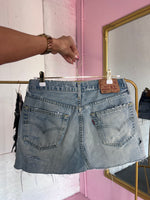 Distressed Light Blue Denim Skirt Created and reworked from vintage denim, destined for landfill! SKIRT MEASUREMENTS: Waist:31” Hips:36” Length:12” Mid Waisted Due to nature of these skirts, they are only eligible for exchange. ...